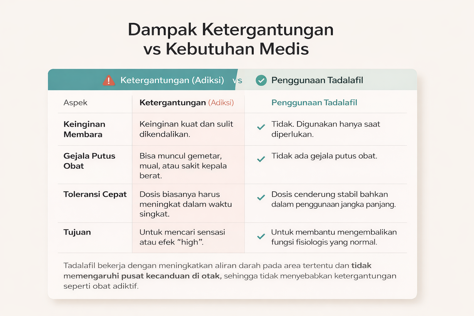 Secara biologis, jawabannya adalah tidak. Tadalafil tidak bekerja seperti nikotin atau alkohol yang merangsang pusat dopamin di otak sedemikian rupa hingga menyebabkan kecanduan fisik.